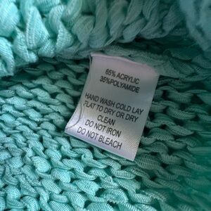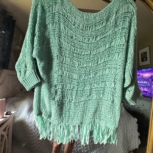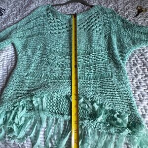 Chic light blue sweater with fringe hem. Open knit design. Perfect for layering.