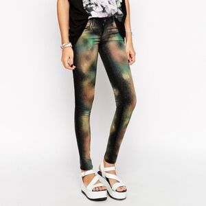 Designed by Michelle Siwy, hazy airbrushed spots bring a cosmic element to colorful Wildfox skinny jeans.