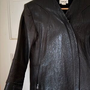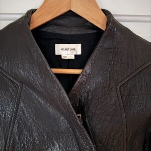 Chic black leather jacket with a modern minimalist design. Features pebbled leather and a strong structured shoulder, falling at the waist in a V shape when zipped up, for a sleek tailored fit. The zipper is slightly angled. Perfect for adding edge to any outfit. Size L, fits 36.5” chest.
