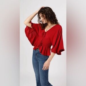 Red Flowy Sleeves Boho Smocked Waist Top Tassel Tie Front