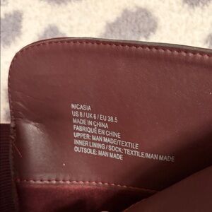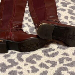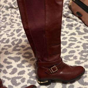 Worn only twice! Chic over the knee boots in rich mahogany color faux leather. Features sleek design and buckle detail. Perfect for stylish outings.