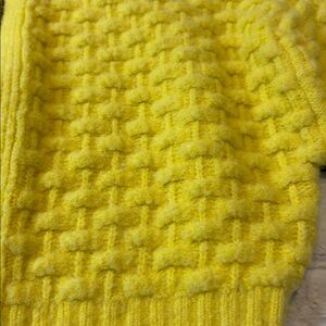 This sunny yellow cardigan from Anthropologie showcases a unique textured knit pattern, offering a stylish and cozy appeal. Full balloon sleeve with ribbed cuff adds to the unique style of this SOFT sweater.