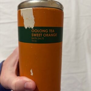 Best smelling bath salts ever!! 16 oz of Oolong tea sweet orange bath salts in original container. Contains sea salt crystals, sweet almond oil, sodium bicarbonate, & orange essential oil fragrance. Made in Thailand by Bathology of Oakland Ca. Container has lots of wear but the bath salts are heaven "scent". NWOT