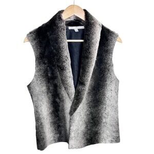 Emil Rutenburg Collection women's sleeveless vest in a striking black and gray ombre faux fur. Designed with a dramatic shawl collar and an open front, this vest adds a touch of sophisticated texture to any outfit. The interior is lined in smooth black fabric for comfortable wear. Size 8. Made in China. 100% Polyester. Dry clean only.