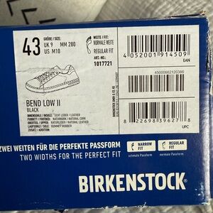 Birkenstock Bend Low II Leather Sneakers Size 43 Regular/Wide (Men’s 10/Women’s 12) Color is Black. These are brand new in box just tried on but noticed that the sole came unglued so if you are a ‘DIYer’ and want to glue back together or want to take to a Cobbler to fix for an amazing shoe for a great price this is for you! Please see last photo for flaw.
