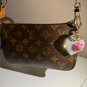 Add a touch of elegance to your accessories with this stunning silver heart keychain with an UPCYCLED Chanel charm. Featuring a beautiful pink rose detail, it's perfect for adding charm to your keys or bag. ✨THE AMOUNT OF SPARKLES ON THIS IS AMAZINGLY STUNNING!!! ✨