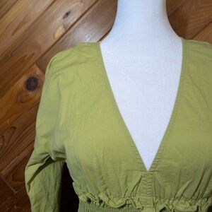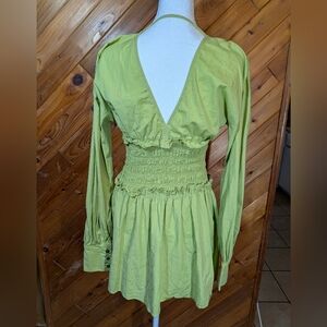 Chic lime dress with deep V-neck. Smocked waist enhances silhouette. Perfect for stylish outings.