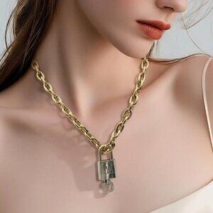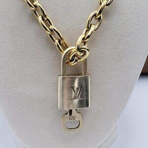 Elegant high-quality gold-plated chain necklace featuring an authentic Louis Vuitton padlock and key. The chain is non-tarnish, hypoallergenic, and designed to deliver an elegant, luxurious lookβperfect for everyday wear, layering, or gifting.