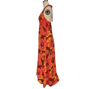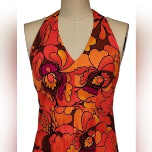 Beautiful true vintage dress from around 60s-70s. No brand label. Pink orange, bold floral pattern. Full length, halter tie back style.