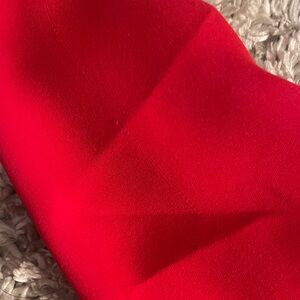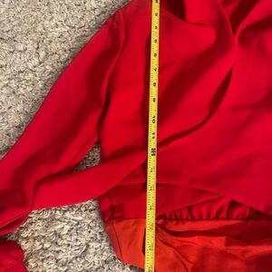 The product is a Babaton Aritzia bodysuit in size XXS, featuring a red solid color with long sleeves and a tie front closure. This cropped blazer-style top has a collared neckline and is made of polyester material. It also includes accents such as buttons and a bow, and has a slim fit for a modern and stylish look. Ideal for women looking for a unique and trendy addition to their wardrobe, this blouse offers a classic/fitted sleeve design with a touch of stretch for comfort and style. Note there is a tiny snag on the left sleeve (see pictures) otherwise this is in perfect condition. Comes from smoke free pet free home