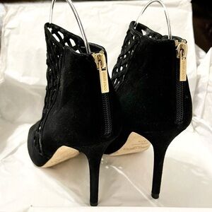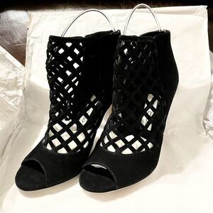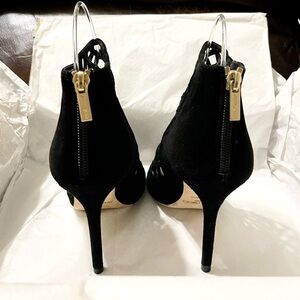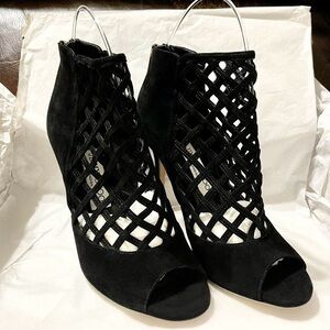 Jimmy Choo fishnet gladiator ankle peeptoe bootie Supple suede lthr blk EU37.5