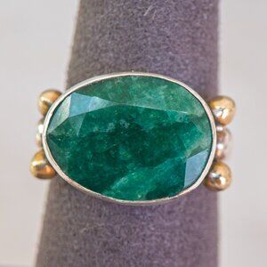 A bold sterling silver ring set with a large oval faceted emerald, finished with warm brass accents for a mixed-metal look. The stone has an earthy, natural character—deep green with visible inclusions—set in a substantial bezel that gives the piece a strong, sculptural silhouette.