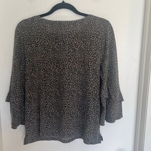Chic leopard print blouse. Features elegant ruffle sleeves. Ideal for versatile styling.