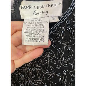 Stunning vintage 1990s Papell Boutique Evening shirt sleeve top in a size large. This elegant piece features intricate black and silvery beadwork in a leaf and floral motif over a black silk base. Basque waist hem adds a delicate finishing touch. Fully lines with a back zipper closure. Perfect for cocktail parties, formal events or vintage collectors. Has subtle shoulder pads, Excellent used condition, non-smoking home.