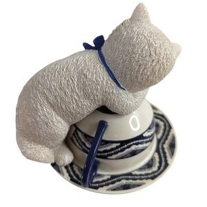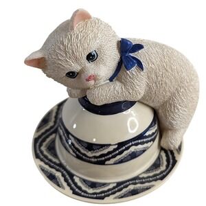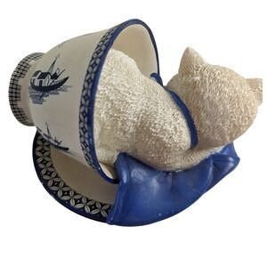 Cat Kitten Figurine with Teacup and Saucer Ceramic Collectible Blue White 2009