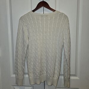 Classic Polo Ralph Lauren cable-knit sweater in a timeless cream/ivory color. Features a traditional crew neckline, long sleeves, and the iconic embroidered Polo logo at the chest. Soft, cozy knit with a flattering, versatile fit—perfect for casual wear or layering in cooler seasons.