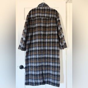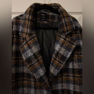 Chic plaid trench coat by Cotton On. Features a stylish blend of black, gray, and brown. Perfect for layering in cooler weather.
