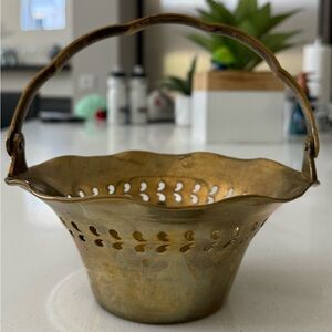 This breast basket is made in India. It’s in good condition and has a scalloped rim. The handle is movable. It has natural patina and measures 3” x 6.75”. The handle extends to 7 inches.