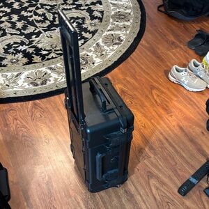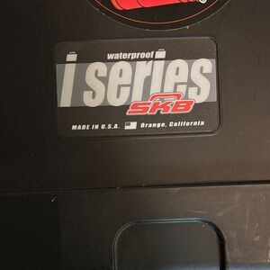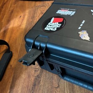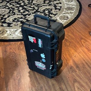 Durable black hard shell case. Decorated with various stickers. Ideal for secure storage and transport.