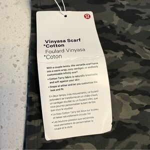 lululemon Vinyasa scarf in a green camo print. This iconic convertible scarf features snap buttons along one edge, allowing it to be worn multiple way: as a wrap, infinity scarf, shawl, or light layering piece. Made from soft cotton with a substantial feel that works year-round for travel, workouts, or everyday wear.