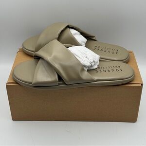 New in box Journee Collection Addilynn slide sandals in muted sage green. Soft crossband design and ultra-cushioned sole—ideal for lounging or out-and-about days.
