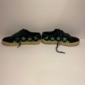Beautiful authentic black suede and leather sneakers with green star print. Base of sneakers is a beige color.
