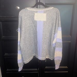 Cozy gray sweater with lavender floral design. Features striped sleeves. Perfect for casual wear.