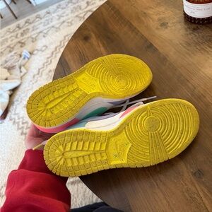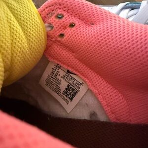 Colorful Nike sneakers. Features pink, purple, and blue accents. Perfect for play and style.