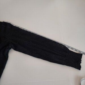 Size lg Sundance Dorina Black Lace Mock Neck Blouse. 84% cotton 16% nylon. Smocking at neckline and yoke. Back button closure. Full blouson sleeve with elastic cuffs. Hi-lo hemline. Pit to pit 23" Sleeve length 25.5" Shoulder to hem length (front) 25" (back) 27.5". Lining is missing for this top so item is priced to reflect this. This top is still in very good pre-owned condition