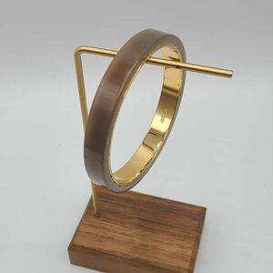 This bangle is in very good pre owned condition. Resin and Gold plated brass. Fits a 7" wrist. Color in the light is a taupe to a Military green.