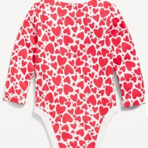 This charming bodysuit features a vibrant red heart pattern on a crisp white background, perfect for a love-themed look. The long sleeves and white trim add a classic touch, making it a delightful addition to any wardrobe.