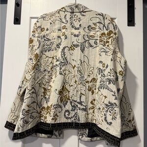 Chic linen blend blazer with intricate floral design features cream and gold tones with mod black accents. Ideal for elevating your wardrobe and layering. EUC. Women’s size 2X, measures 29” from shoulder to bottom hemline, 28” pit to pit.