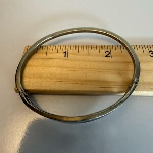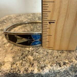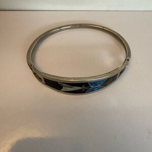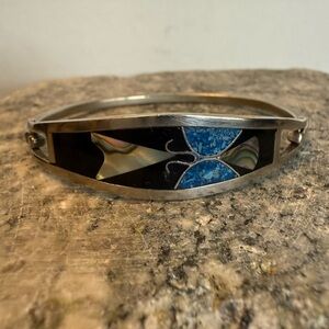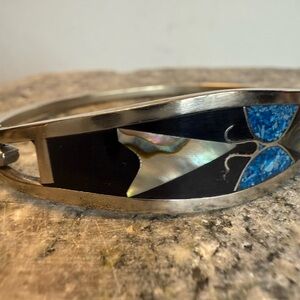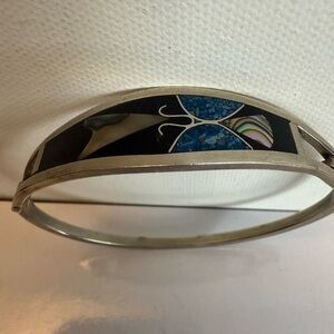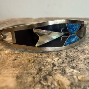 Silver tone inlay bracelet with unreadable markings. Side latch. Non magnetic. Perfect for stacking or wear alone. See photos for size and markings.