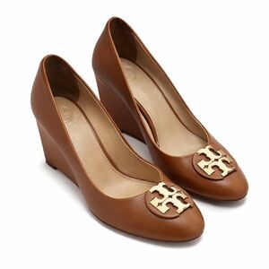 Tory Burch Tan Wedges with Gold Emblem