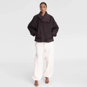 KBB by KAHLANA delivers timeless, elevated essentials that blend everyday wardrobe staples with subtle, luxe style. The Shawl Collar Jacket flips the script on classic bomber style. An exaggerated knit collar, shirring details, and unexpected asymmetric design make it a true statement piece. An oversized fit brings volume and drama, while the lightly padded, fully lined interior make it as functional as it is fashion-forward. Warm but never bulky, it's the perfect layering piece to take you through the seasons.