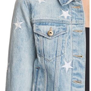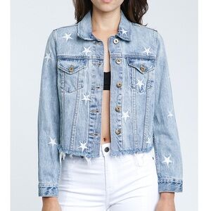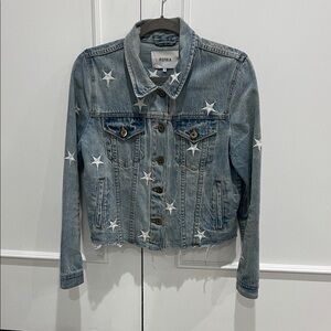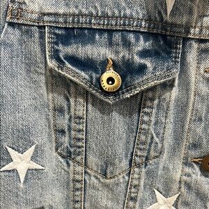 Stylish blue jean jacket. Features white star accents. Classic button-up design. Perfect for casual wear.
