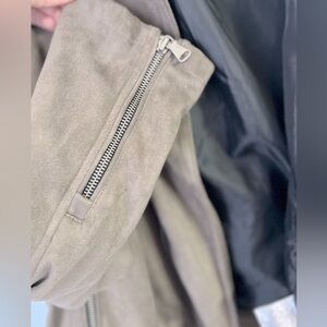 casual faux suede motorcycle jacket, polyester inner lining.