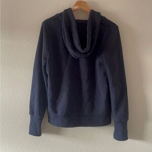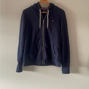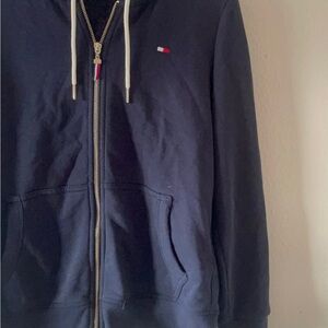 Stylish navy hoodie with full zip. Features drawstring hood. Perfect for casual outings. In great condition!