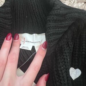 Stylish black sweater featuring charming white heart designs. Ideal for a cozy, fashionable look. Perfect for Valentine’s Day!!