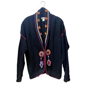 Odille Black Lace Rose Overlay Cardigan Sweater Cream Trim Button Front Size L