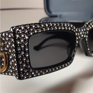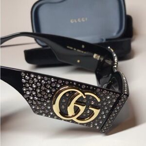 Chic Gucci sunglasses with a bold black frame. Adorned with shimmering crystals. Features iconic Gucci emblem. Gucci Black Crystal-Cut Sunglasses Rectangular acetate-frame sunglasses in black. Crystal-cut detailing and studs throughout.