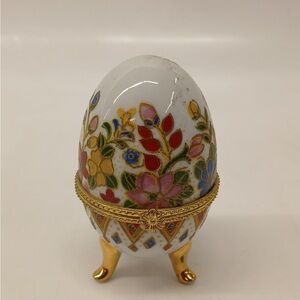 Vintage Porcelain Floral Egg Hinged Trinket Box with Gold Accents