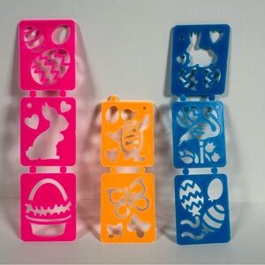 The puzzle is in immaculate shape- first time putting it together for the photo. Pieces are sturdy and quality. Features panda painter, Casey the dog, bear ballerina, cat, birds, bunnies, Easter eggs, Easter basket. Also comes with added 8 Easter stencils and one Easter mini kaleidoscope.