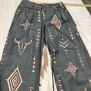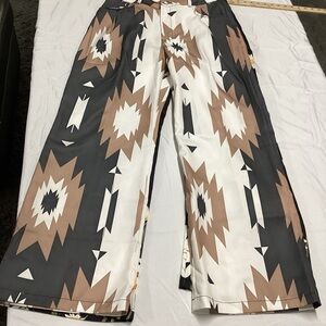 Elevate your wardrobe with these chic wide leg pants featuring elegant floral and geometric patterns. Perfect for adding a touch of sophistication to any outfit.