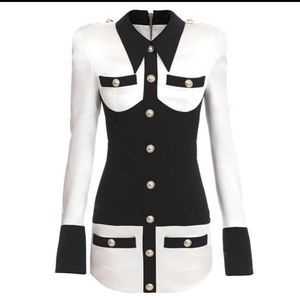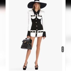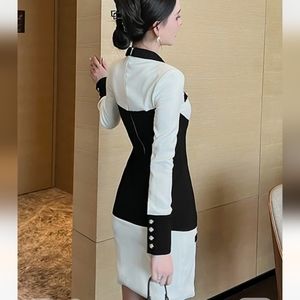 This chic black and white dress features a sophisticated button-up design, perfect for any occasion. The contrasting colors create a timeless look that is both modern and elegant.