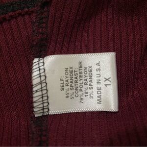 Boho-inspired long sleeve top featuring an allover tribal/geometric print in black and tan with burgundy contrast panels. Scoop neckline, ribbed side panels, and curved hem for a flattering fit. Soft, stretchy fabric. Great for casual wear, fall layering, or festival style.