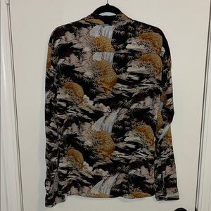 Make a bold statement with this striking AllSaints long sleeve button-down shirt featuring an Asian-inspired tiger print. Known for their edgy, modern aesthetic, AllSaints delivers standout style with this slim-fit piece. Perfect for elevating a casual look or adding personality to a night-out outfit.