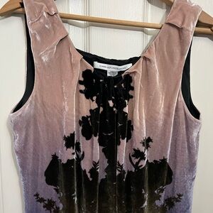 This beautiful dress is by Diane Von Furstenberg. It is a silk blend and has a super soft velvet feel. It has a beautiful pattern to it and an ombré in the color.