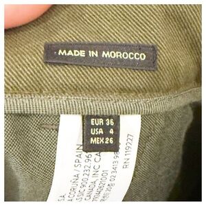Massimo Dutti pants, olive green trousers, size 4 pants, straight leg pants, tailored fit, minimalist style, European fashion, button fly pants, woven cotton pants, smoke free, pet free, excellent condition, made in Morocco