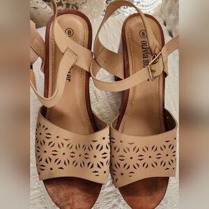 Step out in style with these Olivia Miller platform sandals. Featuring a chic tan color, these shoes are perfect for any occasion. The intricate cut-out design adds a touch of elegance.